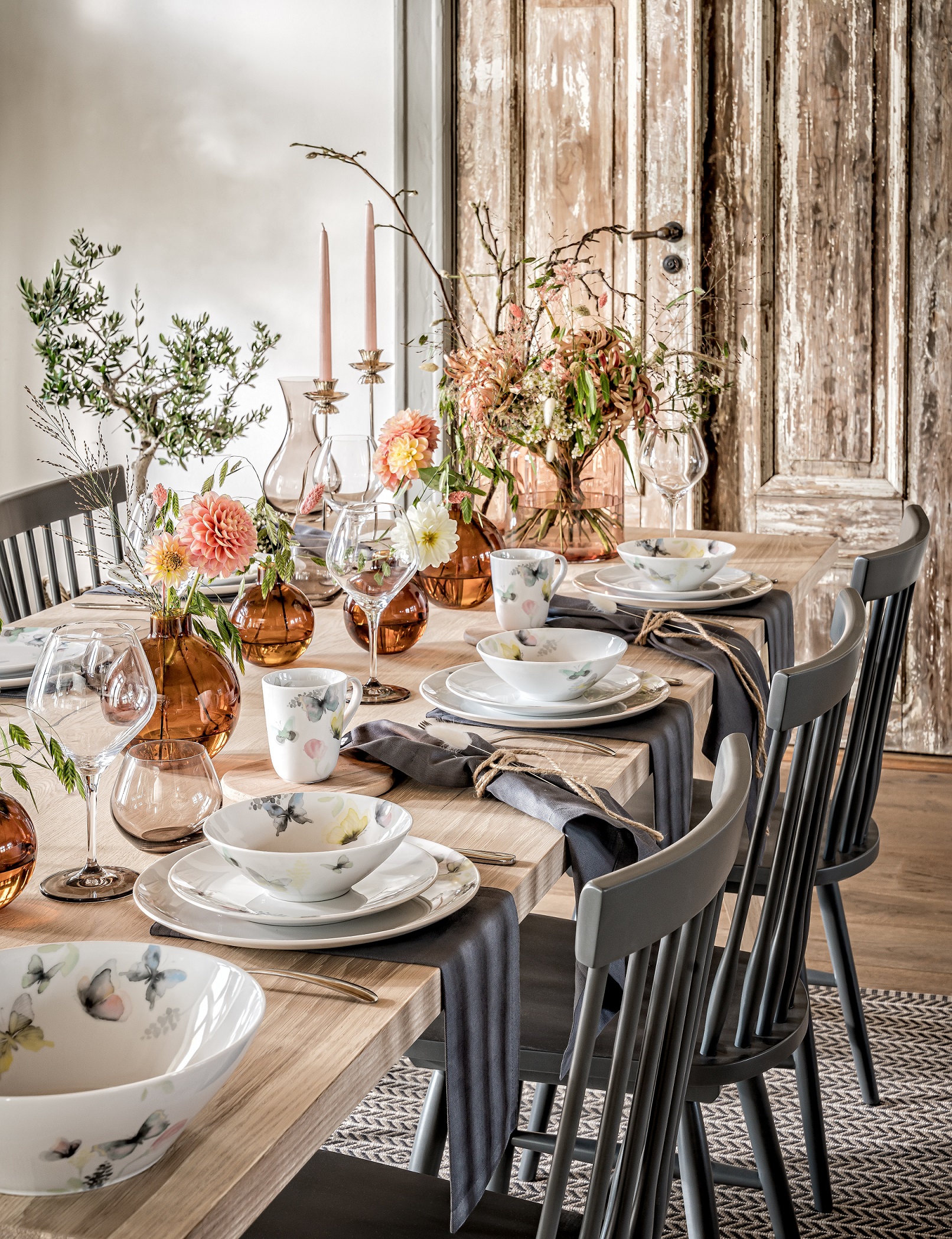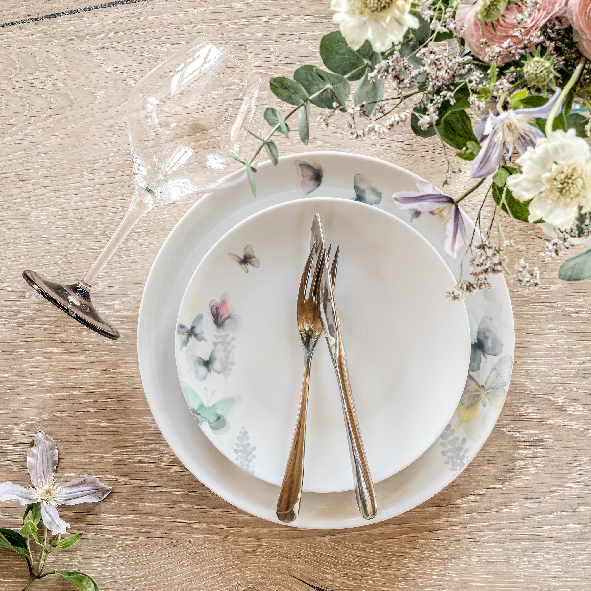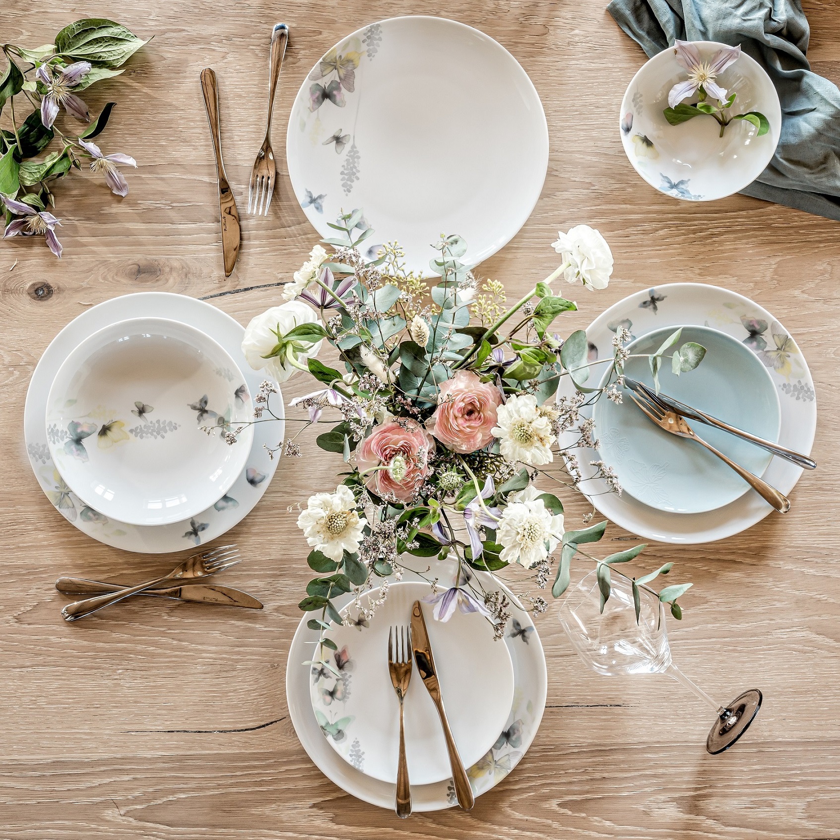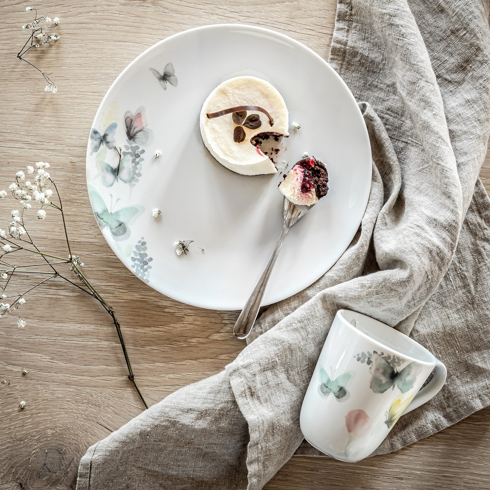 Inspiracją do stworzenia dwunastoelementowej zastawy, obejmującej talerze, kubki, miski, półmiski, dzbanki i patery, była miłość Cecilii do motyli i ich silnej symboliki, która zaowocowała niezwykłymi wzorami. Tak jak każdy gatunek motyla jest inny, tak każdy element porcelany ma swoje niepowtarzalne niuanse i unikalną kolorystykę. Modny akcent stanowią również dwa ręcznie glazurowane elementy w kolorze turkusowym z reliefem o kształcie dyskretnych motyli, dające możliwość stworzenia kreatywnej aranżacji stołu o indywidualnym charakterze.